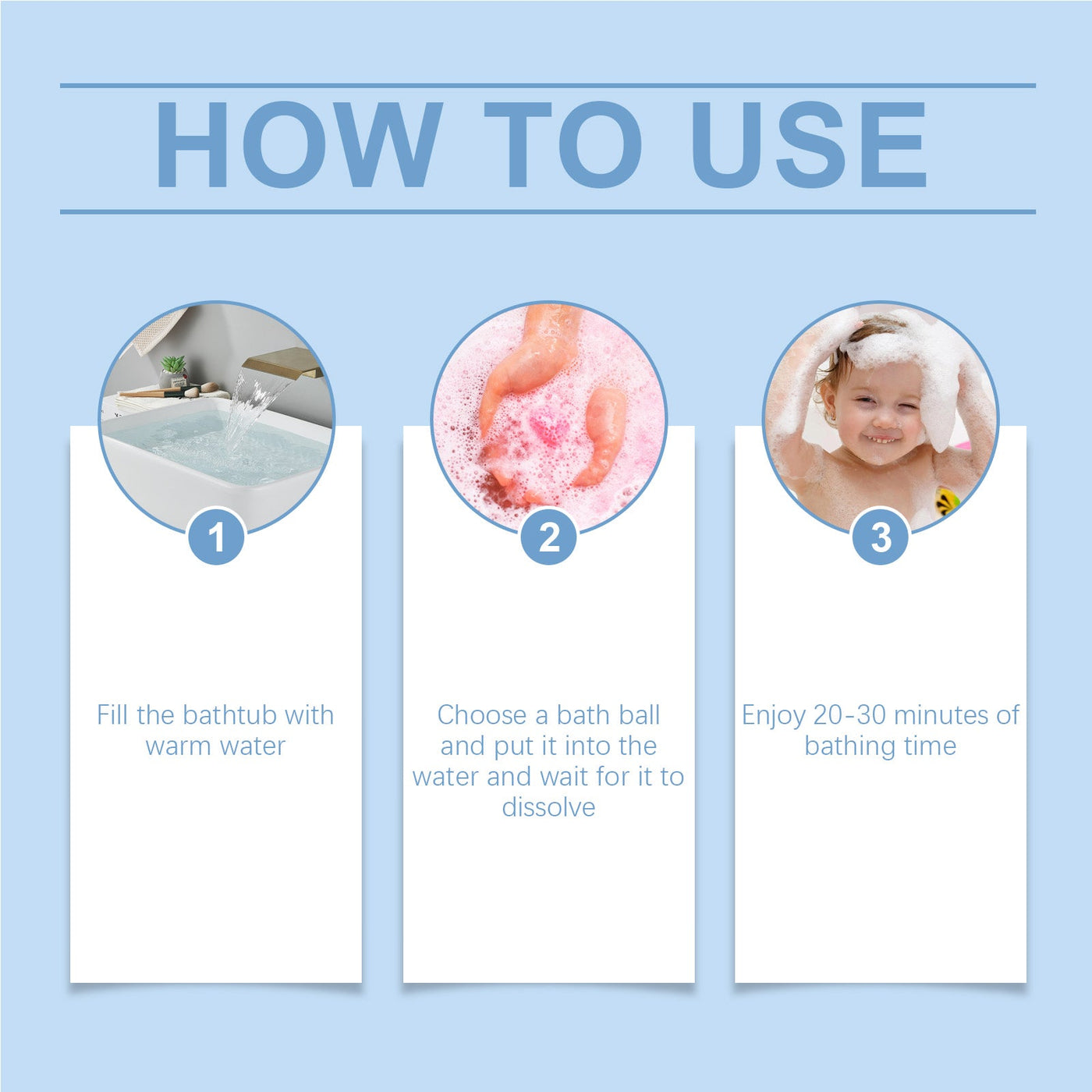 Our children's bath balls contain rosemary extract, lemon extract and lily extract. It can increase skin shine. Soothe skin, improve skin cleanliness; Moisturize and nourish skin, enhance skin softness. Its use method is simple: 1. Fill the bathtub with warm water; 2. Choose a bath ball! Then put it in the water and wait for it to dissolve; 3. Enjoy a 20-30 minute shower. It is scented with rosemary and lavender, which can relax people and relieve the fatigue of the day. The unique fragrance technology allows the skin to exude elegant flowers for a long time after bathing.